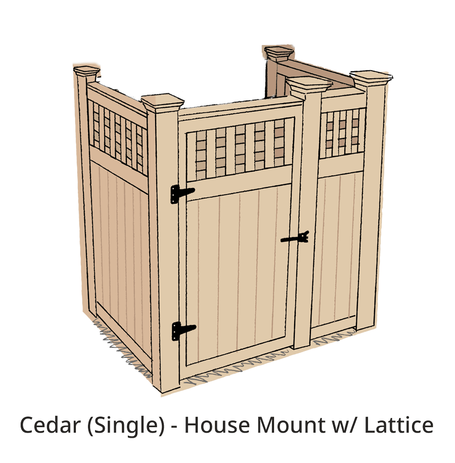 Our standard sized outdoor showers are where it all started! The Standard Cedar House Mount is consistently our best selling outdoor shower enclosure kit. Made from high quality knotty cedar or elegant “thick & stocky” PVC, these kits are low maintenance and durable to stand up to the elements. *Modular design also allows for the door to be installed on any side of the kit for these models.