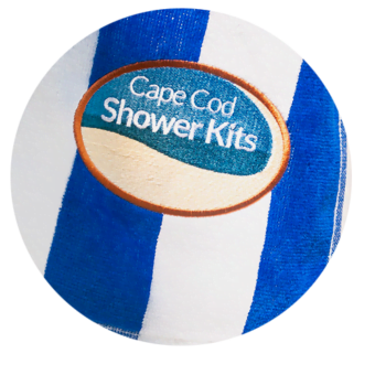 Woven quality beach towel with custom embroidered Cape Cod Outdoor Shower Kits logo.