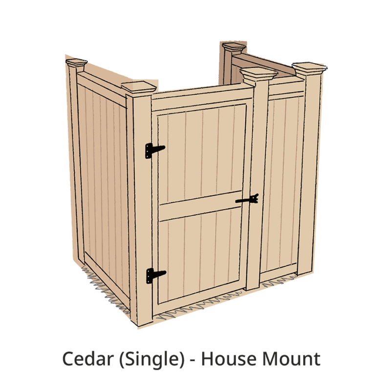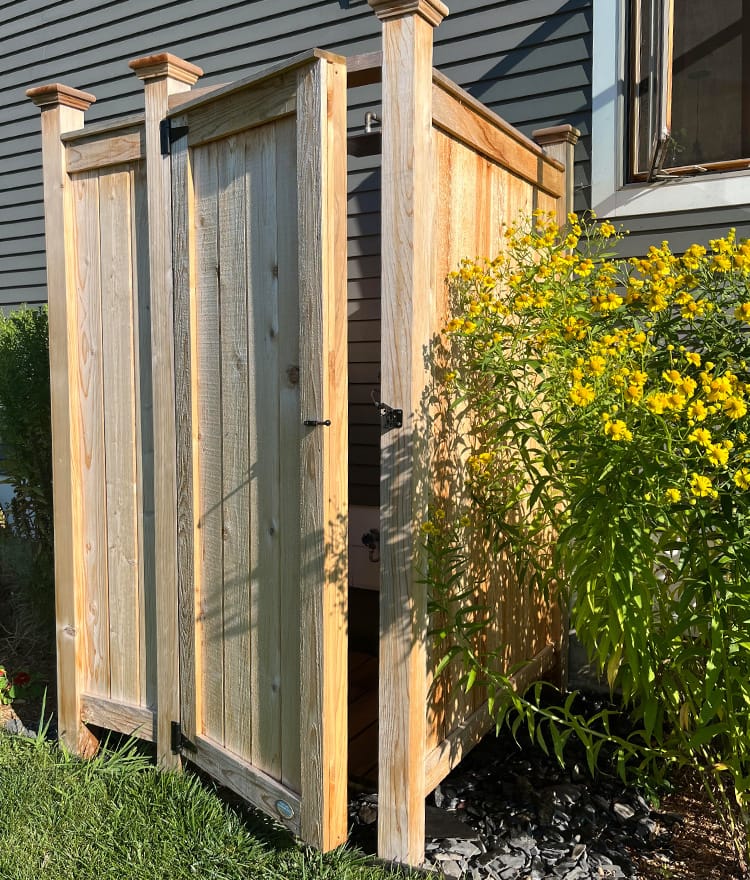Our Standard House Mount Outdoor Shower Enclosure utilizes the side of a house as a wall and is our first and most popular outdoor shower enclosure kit. The extra posts complete the look offering a more finished look for your shower.