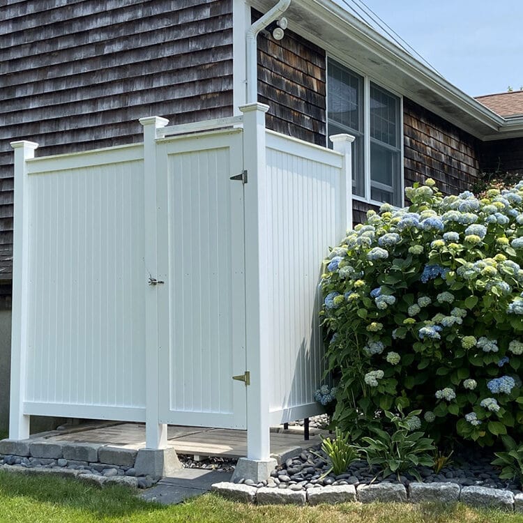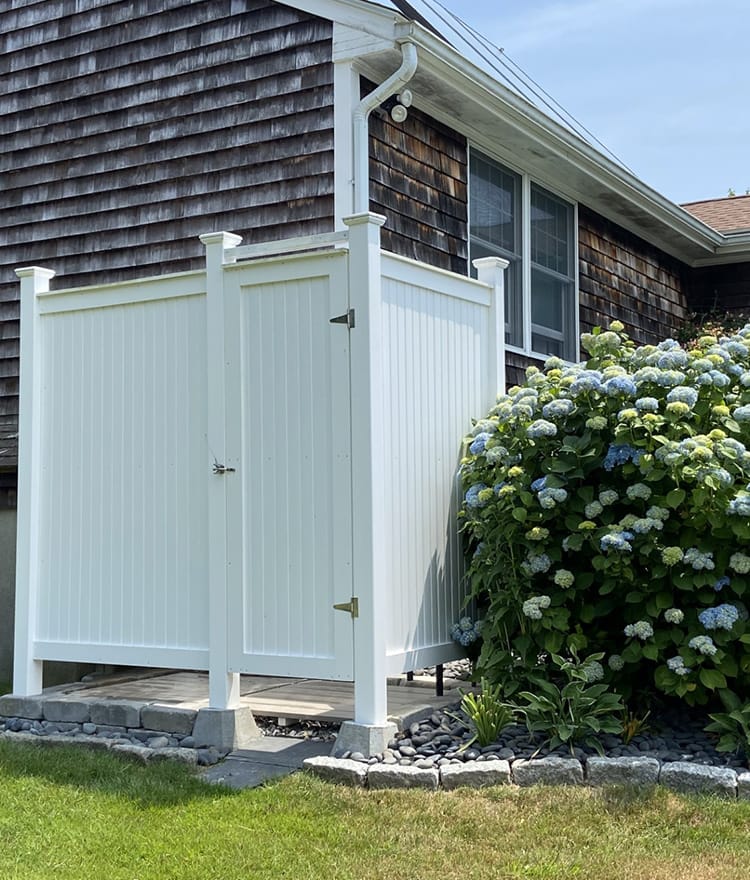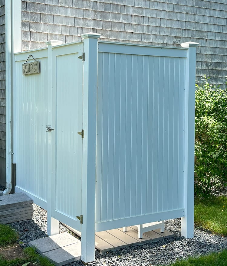 These outdoor showers can be made in cedar or PVC, offering a mid-size version. Made on Cape Cod with the best ingredients only. Available as our best selling cedar kit or here as Azek style PVC.